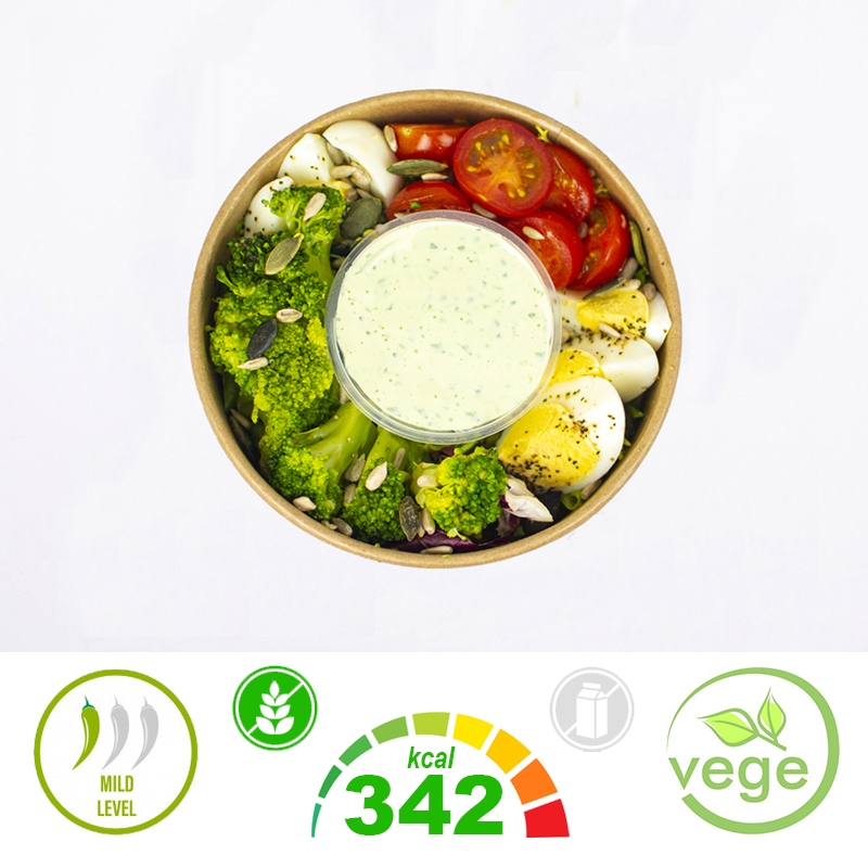 Składniki: jajka (JAJA KURZE gotowane i obrane, woda, sól, regulatory kwasowości: kwas cytrynowy, kwas octowy, kwas mlekowy) 23,7%, brokuł (brokuł 99,9%, sól 0,1%) 21,2%, mix sałat (endywia escarola, endywia frisée, cykoria radicchio, rukola) 19,3%, sos czosnkowy (jogurt grecki (MLEKO pasteryzowane, żywe kultury bakterii jogurtowych) 48,9%, majonez domowy (olej rzepakowy, pasteryzowane żółtka JAJ, musztarda) 37,9%, czosnek 4,3%, musztarda (woda, ocet spirytusowy, GORCZYCA, cukier, sól, przyprawy) 4,3%, natka pietruszki 3,6%, sól 0,5%, sok z cytryny 0,5%) 17,6%, pomidorki cherry 17,5%, nasiona słonecznika 0,4%, pestki dyni 0,4%, pieprz czarny.